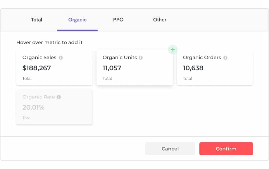 Differentiate between your ad data and organic revenue, to get a clear overview of your Amazon business performance. Combine and compare the data to get an in-depth analysis of the sales based on their source. You can compare each metric performance compared to previouse dates.